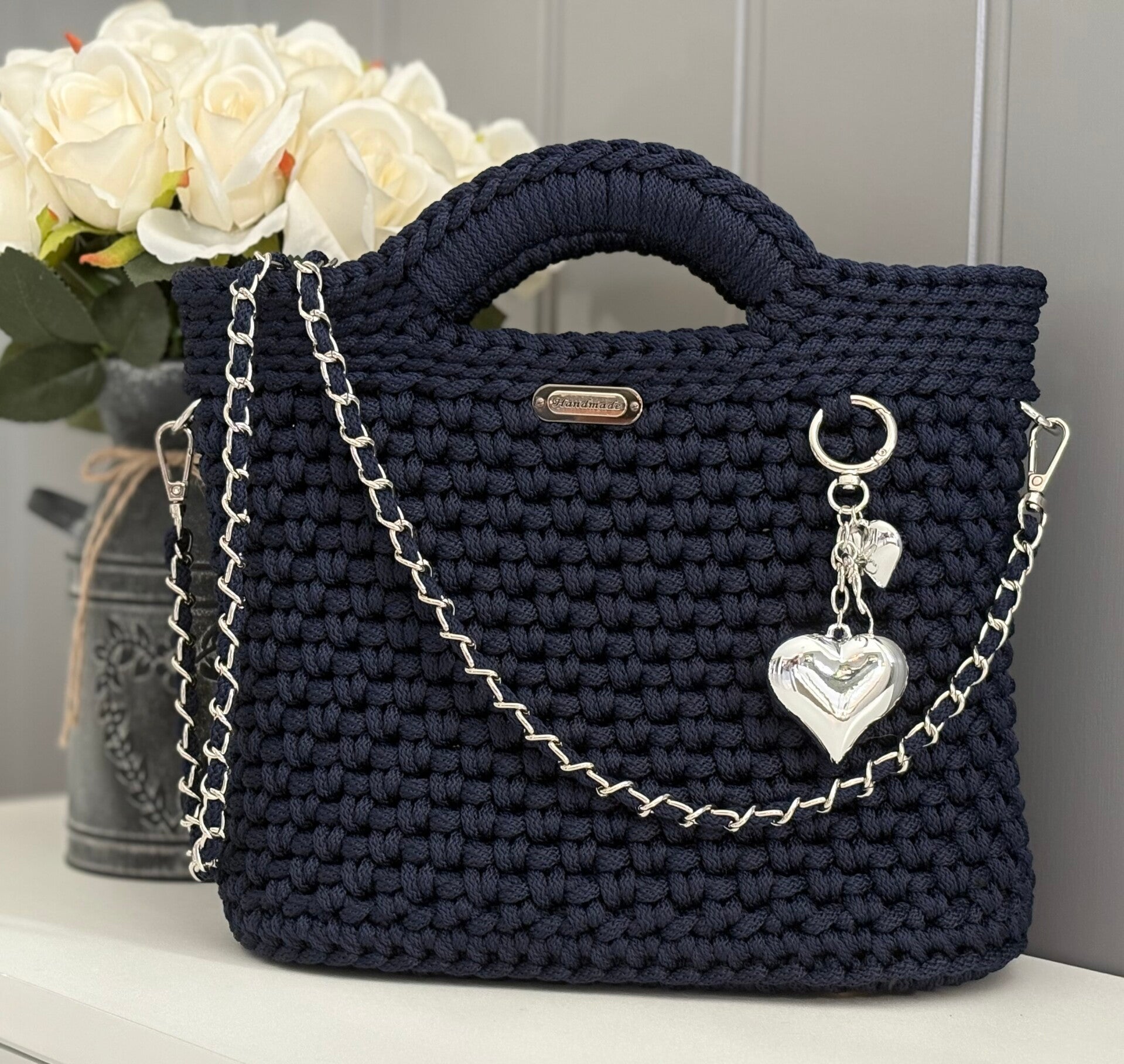 Ønsker du en skulereim å bytte med kan du enkelt legge til en ekstra her. Heklet reim lages i den fargen du har bestilt på vesken. Metallenken lages med tråd i valgt farge på vesken.