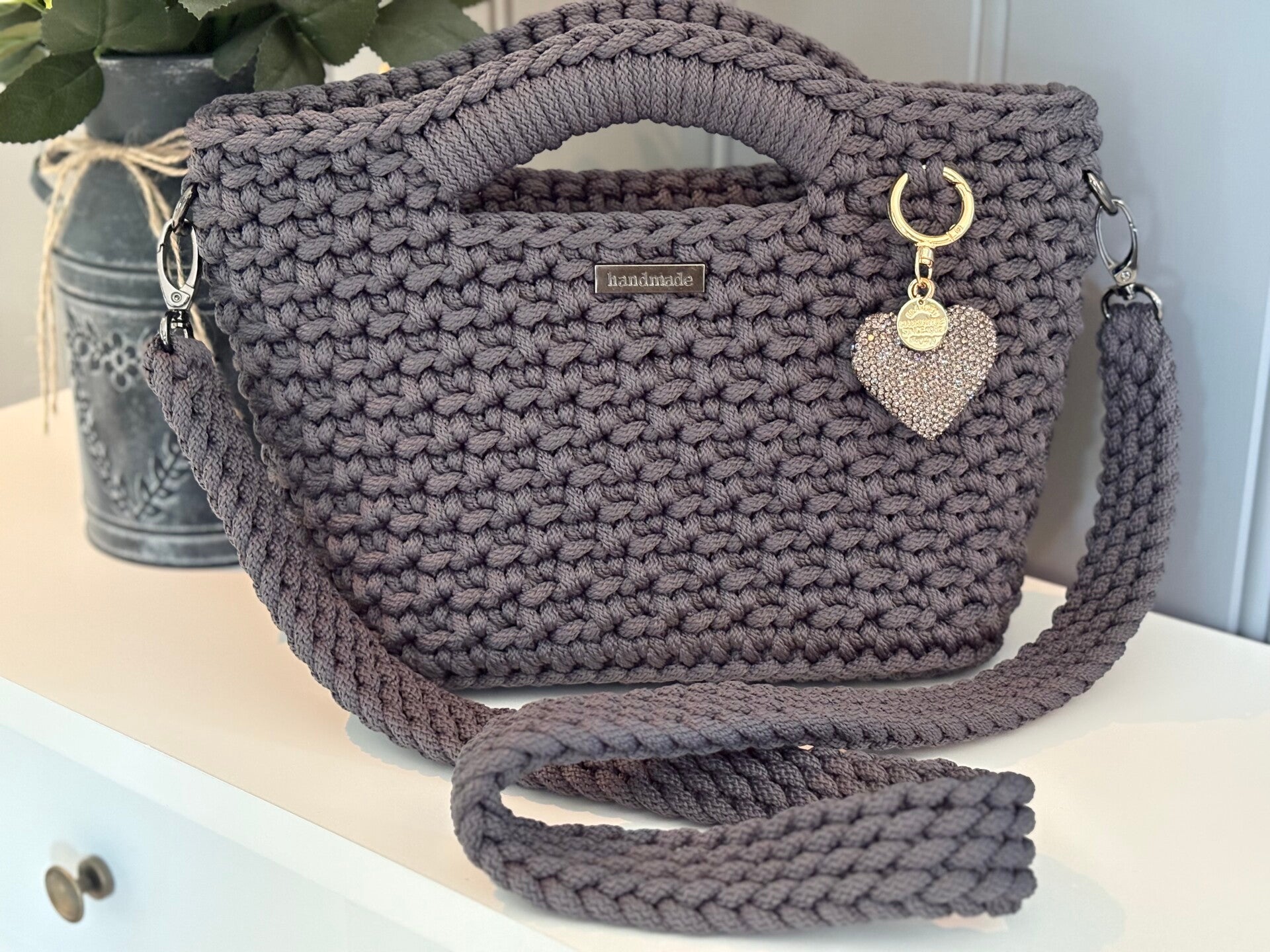 Ønsker du en skulereim å bytte med kan du enkelt legge til en ekstra her. Heklet reim lages i den fargen du har bestilt på vesken. Metallenken lages med tråd i valgt farge på vesken.