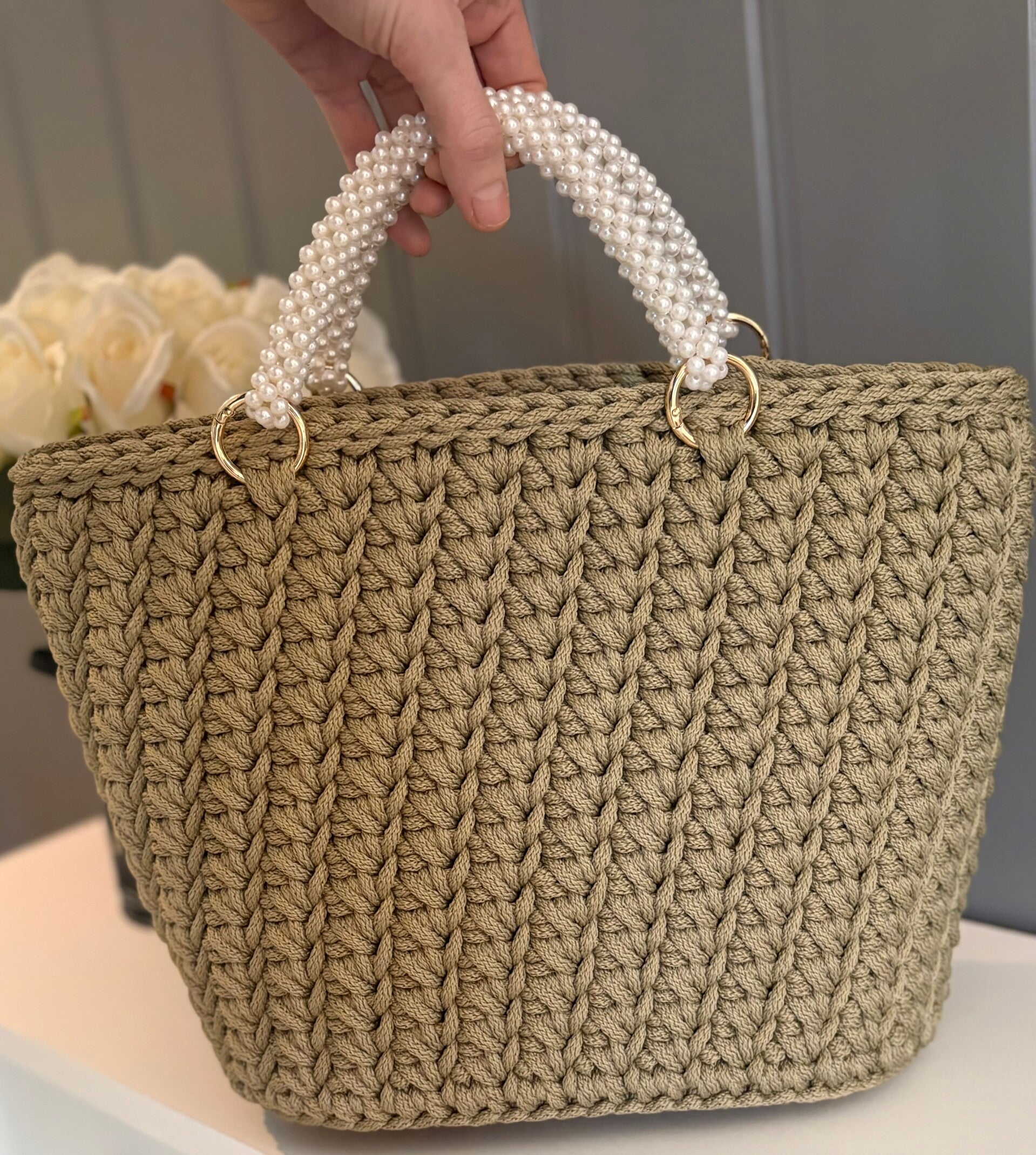 Farge Oliven grønn med perlehåndtak